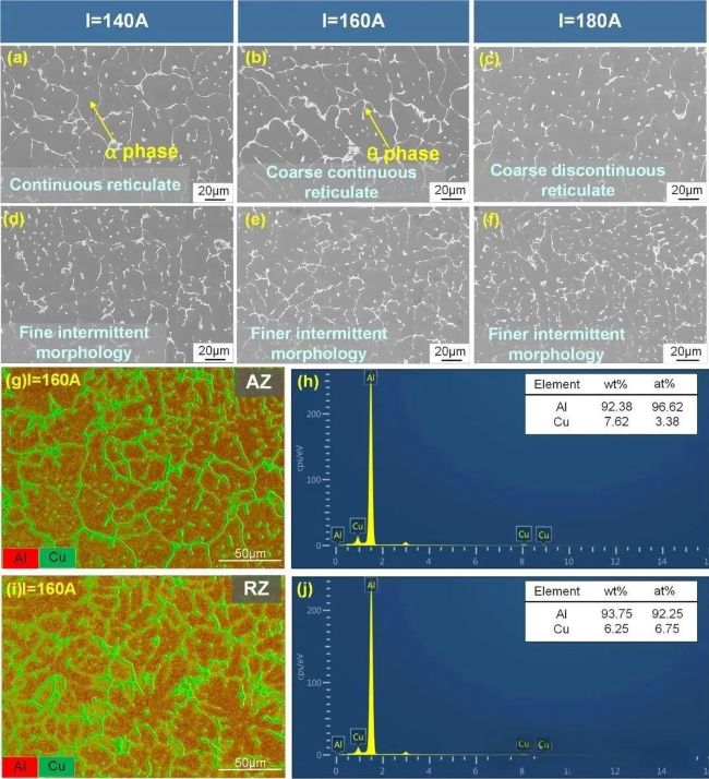 圖9 高倍掃描電子顯微鏡觀察圖像,(a-c) 不同電弧電流下電弧熔化區(AZ)圖像;(d-f) 不同電弧電流下重熔區(RZ)圖像;(h-j) 能量色散譜(EDS)映射結果