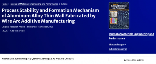2025年10月16日,西南交通大學材料科學與工程學院的研究團隊在《Journal of Materials Engineering and Performance》期刊發表最新研究文章“Process Stability and Formation Mechanism of Aluminum Alloy Thin Wall Fabricated by Wire Arc Additive Manufacturing”,研究了電弧電流對2319鋁合金薄壁件電弧增材制造(WAAM)的工藝穩定性、形成機理及力學性能的影響,確定了最優電弧電流參數。本期谷·專欄將對該研究成果進行簡要分享。