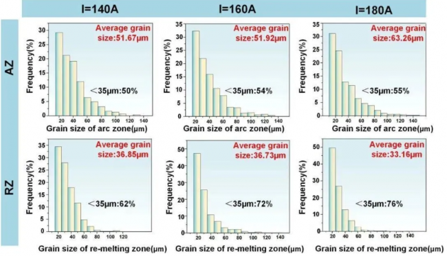 圖13 不同電弧電流下電弧熔化區(AZ)和重熔區(RZ)的晶粒尺寸分布,(a) I=140A;(b) I=160A;(c) I=180A