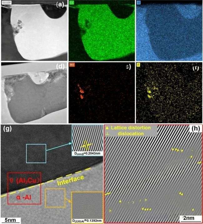 圖11 透射電子顯微鏡(TEM)觀察到的試樣顯微組織:(a-f) θ相的形貌及化學成分;(g-h) 對應Al?Cu相界面高分辨透射電子顯微鏡(HRTEM)圖像的逆快速傅里葉變換(IFFT)重構圖