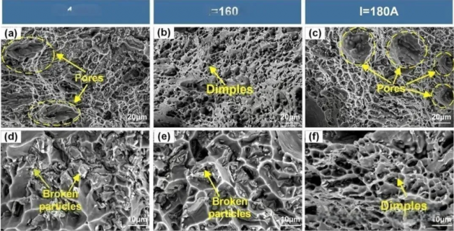 圖16 不同電弧電流下拉伸試樣的斷口形貌,(a,d) I=140A;(b,e) I=160A;(c,f) I=180A