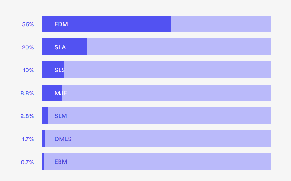 不出所料,F(xiàn)DM(熔融沉積成型)仍然是參與調(diào)查的人最常見的選擇,有56%的人表示這是他們最常用的增材制造方法。此外,后處理選項的進步正在幫助推動3D打印的采用。