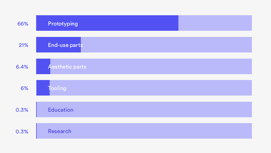 原型制作在全面生產(chǎn)之前開發(fā)樣品產(chǎn)品以評估設(shè)計和功能是3D打印的第一個真正用途,并且仍然占很大份額。66%的受訪者將其列為3D打印的主要用途。其他關(guān)鍵應(yīng)用包括加工、小批量生產(chǎn)、大規(guī)模定制和批量生產(chǎn)。